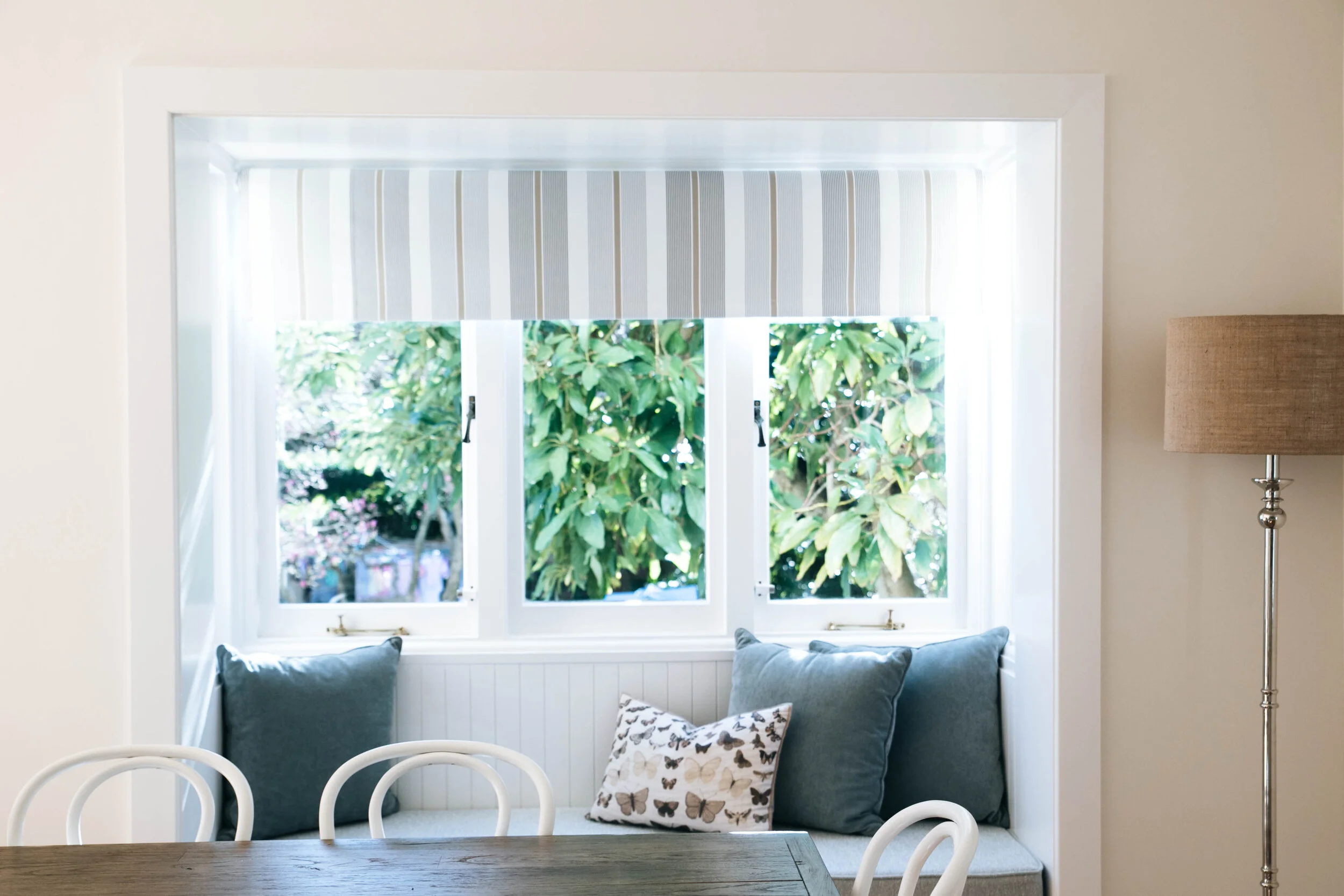 Working with interior designer Angela Steyn on this house in Mosman, Katkalloo created beautiful curtains in a natural linen mix to complement the laid back Hamptons-inspired interiors. Roman blinds in soft pastel colours and pretty patterns were chosen for the kids’ bedrooms and were also a perfect fit for windows with banquette seating.
